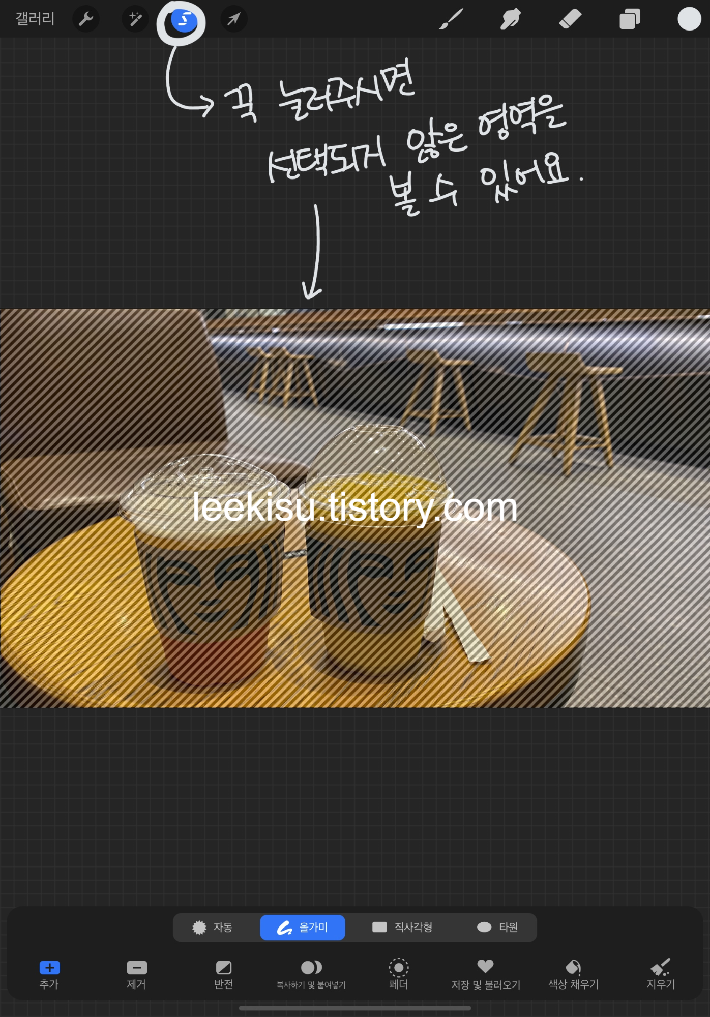 이제 본적 누끼 따기 작업을 시작할 건데요. S자 모양의 선택 도구를 눌러주시고 올가미를 선택, 추가를 선택해 주세요. 그리고 애플펜슬을 들고 원하는 부분의 경계선을 따라 그려줍니다.🙆♀️