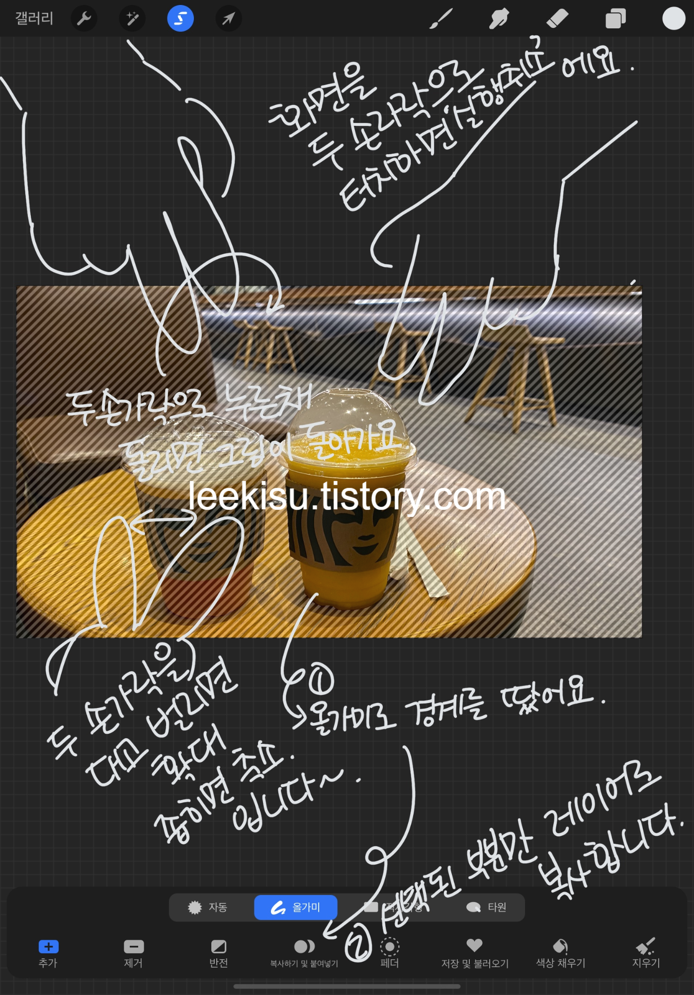 따라 그리다보면 손에 그림이 가려서 제대로 그리고 있는지 잘 안 보일 수 있어요. 그럴 땐 펜슬을 디스플레이에서 떼주시고 두 손가락으로 그림을 돌려서 그려주면 좋습니다. 디스플레이에서 애플펜슬을 떼도 이어 그릴 수 있어요. 이어 그리는 부분을 떨어뜨려서 포인트를 찍으면 그 사이가 직선으로 선택되니 참고해주세요.(직선을 선택할 때 좋아요.) 또 눈금선을 잘못 그어서 이전 작업을 취소하고 싶은 경우 두 손가락으로 화면을 터치하면 '실행 취소'할 수 있어요. 이런 다양한 기능을 잘 활용해서 경계선을 따줍니다.