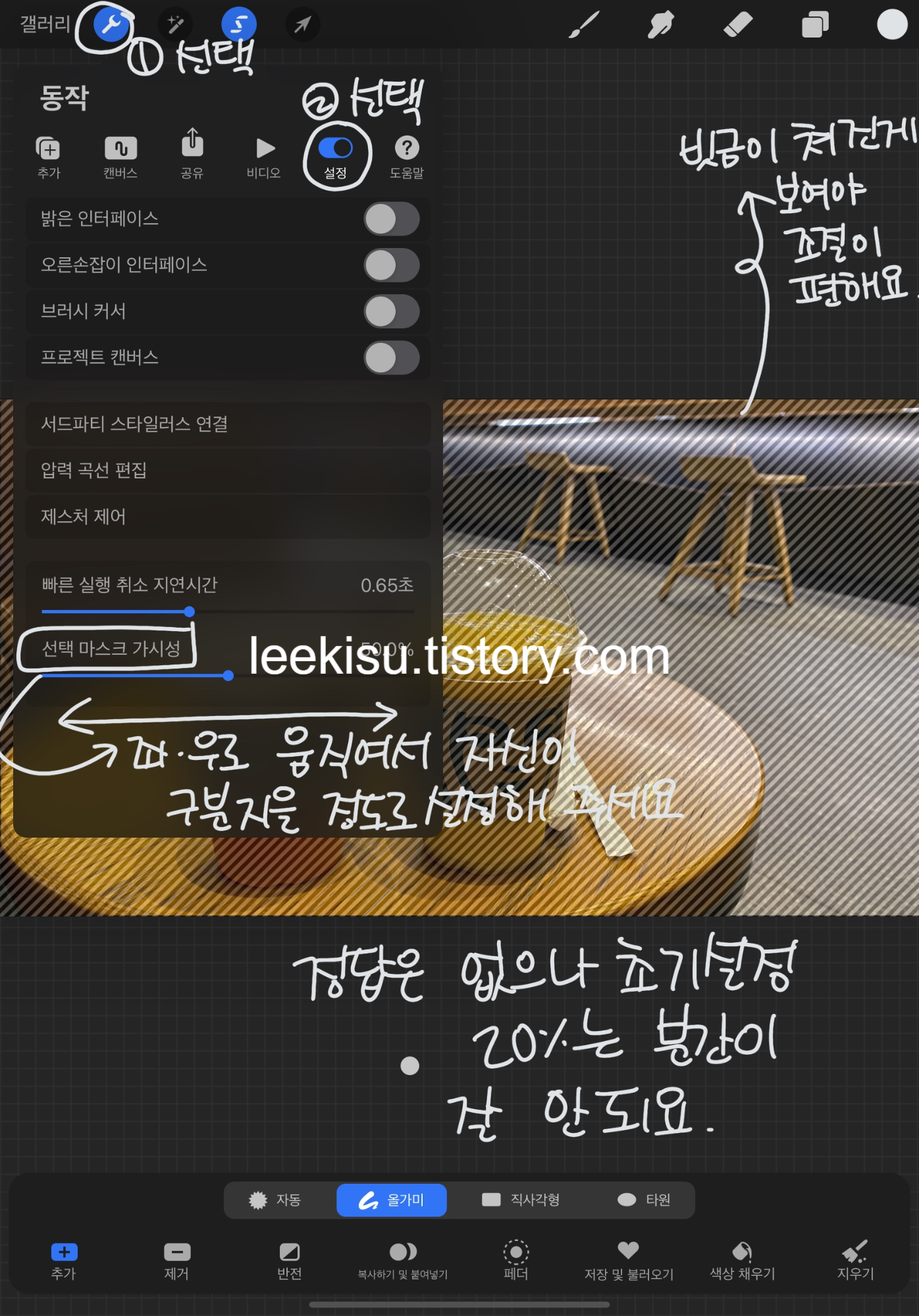 이 상태에서 ①🔧스패너 모양의 설정 버튼을 누르고 ②'설정' 탭으로 이동해서 '선택 마스크 가시성'의 비율을 달리하면서 사진의 빗금의 불투명도를 변화시켜 주세요. 100%에 너무 가까우면 추가 작업에 어려움이 있고, 0%에 너무 가까우면 선택한 영역의 구분이 어려워져요. 저는 딱 중간 50%로 했어요.