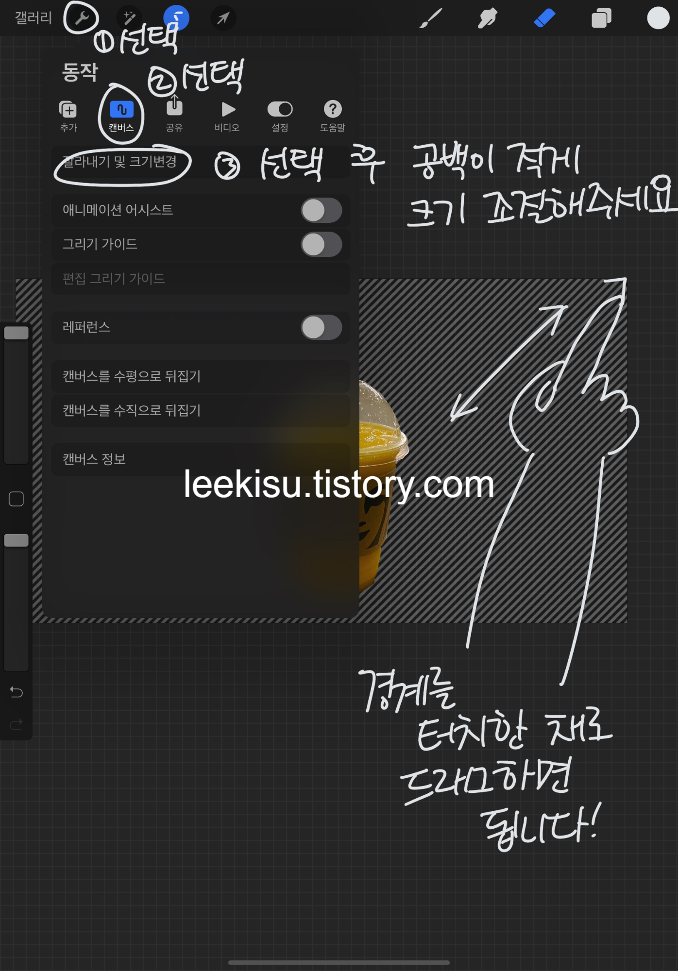 '설정>캔버스>잘라내기 및 크기변경'을 선택하고, 캔버스 크기를 알맞게 조절해 줍니다. 모서리 부분을 드래그해서 줄이면 되요.