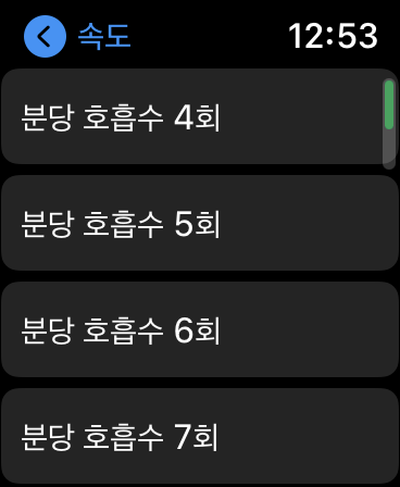 왼쪽 상단에 호흡 수와 총심호흡에 소요되는 시간은 내가 설정할 수 있습니다. 애플 워치에서만 가능한 설정, 애플 워치에서 직접 하는 방법, 아이폰을 통해서 하는 방법 2가지로 설명드릴게요.