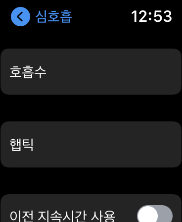 - 이전 지속시간 사용: On/Off로 설정. 말이 좀 헛갈릴 수 있는데, 이전 사용에 설정했던 총 심호흡 시간을 저장할 것인가에 대한 설정 메뉴예요.